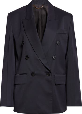 Victoria Beckham’s precision tailoring comes into focus on this double-breasted blazer in a shadow check wool blend that fades in motion. Strong shoulders and peaked lapels set a commanding line, while a silky lining lets it slide over layers with quiet ease.