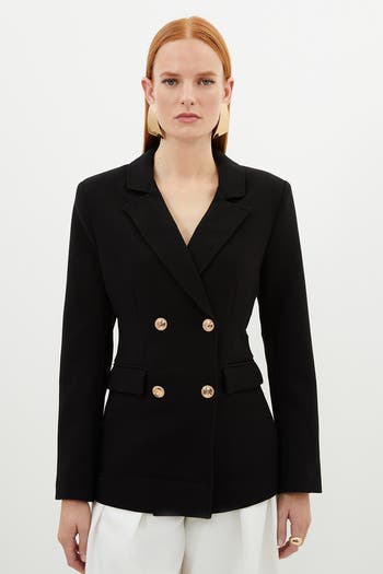 A sculptural rendition of the classic blazer, this piece offers endless sophistication. Sharp tailoring and double-breasted buttons create a cinched silhouette, while classic notched lapels and flap pockets add a traditional touch. Style this blazer with co-ordinating tailored trousers for a powerful ensemble, or size up for a contemporary, oversized aesthetic.
