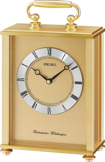 Seiko Tama is a timeless parlor mantel clock from Seiko. The golden color along with the rectangular shape and handle on top are sure to compliment any space. Dual chimes (Westminster/Whittington) on the quarter hour, and hourly strikes follow the hourly chime along with automatic chime silencer (11 PM thru 5:45 AM) and volume control all make this clock irresistible.