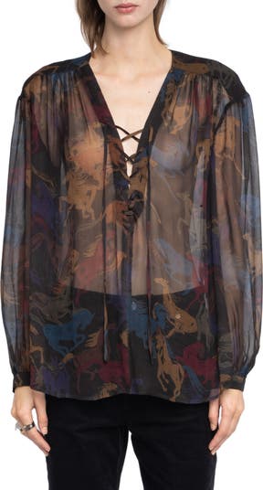 Let your wild style roam free in this boho top made from sheer mousseline featuring a band-of-horses print and a lace-up neckline that s pure rock n roll.