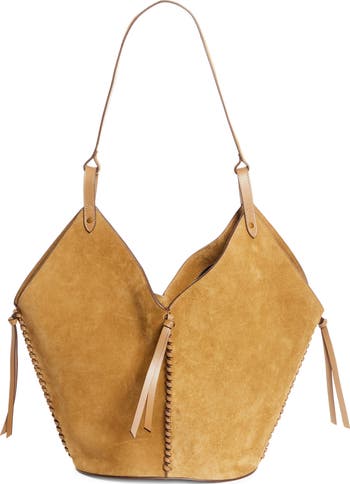 Whipstitching and tassel trim highlight the trapezoidal silhouette of a recently released tote shaped from supple suede.