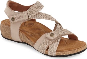 Braided straps with convenient hook-and-loop closures zigzag across a supremely comfy sandal fitted with a cushioned, contoured footbed and a lightweight and flexible rubber sole. A cork platform and wedge complete the look with just-right lift.