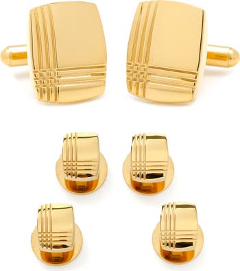 Embossed in an abstract plaid, this set of matching cuff links and shirt studs brings a distinctive polish to any formal look.