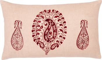 A paisley pattern in blush and plum colors. 12″ x 20″ knife edge decorative pillow cover. Hand screen printed by artisans. 100% Linen Pillow Cover with cotton lining. Hidden zipper enclosure. Insert not included. Handmade in India.