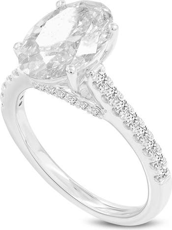 An elegant 3.4 carat Oval Cut lab grown diamond ring in a beautifully crafted 14K gold band and round cut lab grown side diamonds. The ring is accompanied with an IGI certificate with the certificate number inscribed within the band. Diamond carat weight may fluctuate 0.05 carats ABOVE the stated number.
