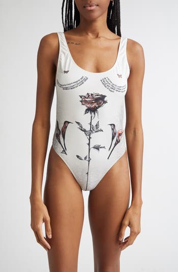 Inspired by Jean Paul Gaultier s trompe l oeil masterpieces, tattooed roses and cheeky additions compete for attention on this one-piece swimsuit with a deeply dipped back.