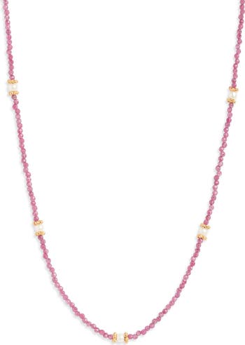 Bring a rosy glow to your neckline with this necklace strung with faceted ruby beads interspersed with glossy pearls and vermeil accents.