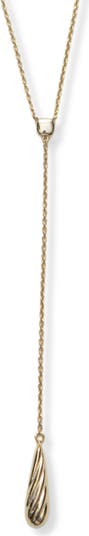 A ribbed texture distinguishes the teardrop pendant that hangs off a delicate sterling silver Y-necklace plated in glowing 18-karat gold.