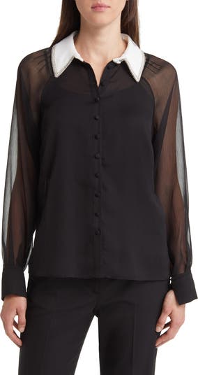 A beaded contrast collar instantly accessorizes this dreamy button-up designed with sheer sleeves and covered buttons.
