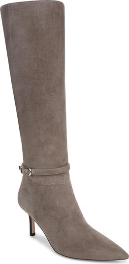 A dainty buckle strap at the ankle provides a polished finish for a knee-high boot fashioned with comfortable and supportive cushioning.