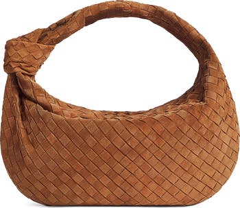 The house s iconic intrecciato weave, crafted from handwoven strips of amber suede, textures this softly structured hobo topped with a knotted shoulder strap.