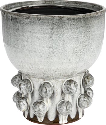 This terra-cotta footed vase with raised dots, white, reactive glaze is a unique and beautiful addition to any home decor. It features a round shape, a glossy finish, and raised dots for dimension. This vase is also ideal for any coastal, beach, farmhouse, French country, or Scandinavian-themed decor, as it adds a touch of texture and elegance. This vase is also perfect for displaying fresh or dried flowers, branches, or greenery, as it creates a stunning and natural look. It is made of terra-cotta, a type of clay that is durable and easy to clean. This vase measures 11 inches in diameter and 12.25 inches in height. This vase is a great gift for anyone.