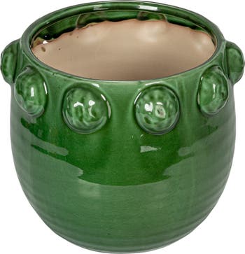 - A stylish and modern terracotta planter that features a shiny green glaze and over-sized raised dots for added texture and interest