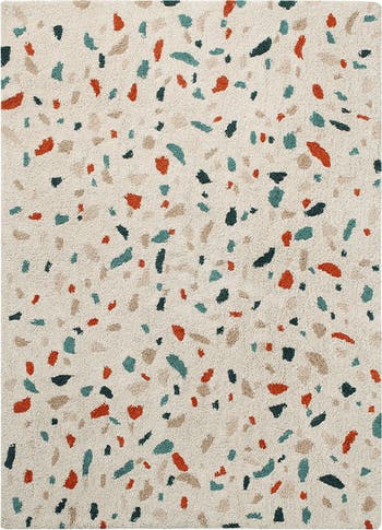 Scattered shapes and colors evoke the sunny beauty of Italian terrazzo on a rug made of high-pile cotton that washes easily in your machine.