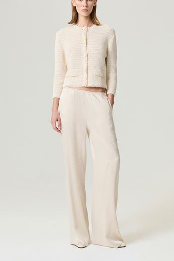 Designed in a soft, richly textured bouclé knit, this cardigan offers a modern yet feminine touch with its boxy silhouette and scalloped button placket. The crew neckline and 3/4 sleeves keep the look polished, while ribbed cuffs and hem add subtle structure. Finished with two mini patch pockets for a charming detail, it sits at hip length and fastens with a classic button front. A versatile layering piece that effortlessly elevates denim, tailored trousers, or skirts — perfect for chic everyday styling.