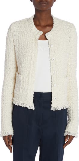 Bouclé and ribbon yarns bring rich texture to this hybrid cardigan designed with a quilted-nylon back panel insulated with lightweight down fill.