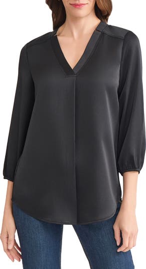 A textured crepe fabric brings touchable charm to this fluid V-neck top framed by three-quarter sleeves and finished with a tuckable shirttail hem.