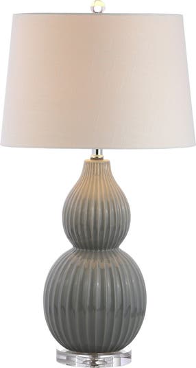 The classic double gourd lamp gets an elegant update with the addition of narrow fluting on this beautiful base. Beautifully made from ceramic, the glossy glaze adds a serene a touch to your favorite hideaway. A classic, white cotton drum shade adds an elegant finishing touch.