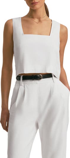 Opt for timeless sophistication in a cleanly designed square-neck shell made from a breathable linen-blend that s enhanced with a touch of stretch.