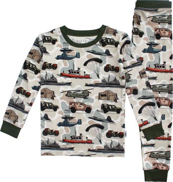 Salute military heroes in a print featuring a desert camo background military vehicles. Buttery soft, magic stretch viscose pajamas your dude or babe can wear from the sheets to the streets.