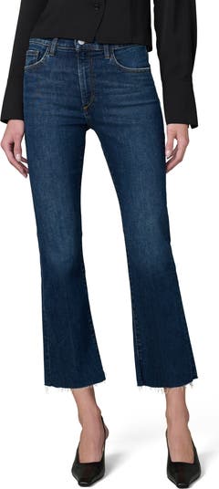 Trendy cropped-bootcut jeans are made with stretchy denim, a casual-chic medium–dark wash and raw hems for a laid-back detail.