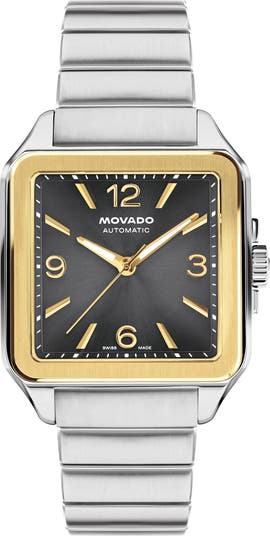 After a century of iterations, Movado revives this petite square watch from the art deco era. Centered with a sunray dial and set on a leather strap, it s punctuated with a floral-embossed crown straight from the archives.