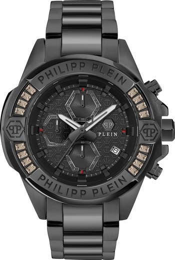 Geometric and logo motifs are artfully arranged for both readability and a refined look for this multifunction watch featuring a crystal-accented matte-black design and a Japanese-made chronograph quartz movement.