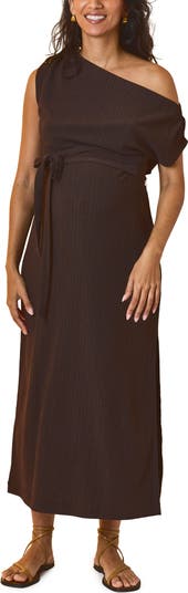 The midi dress of dreams—rich in color, lightweight textured fabric, and an aysmmetical neckline to beautifully sit off of the shoulder. Drapes effortlessly over the bump and features delicate stich detailing.