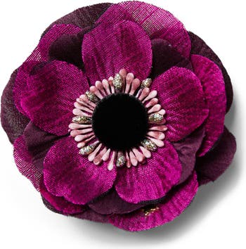 Originally derived from the Greek word anemos, meaning wind, the anemone has served as a symbol of anticipation and excitement since the Victorian era. Handcrafted with magenta silk charmeuse and aubergine silk shantung petals, this vibrant flower showcases a mix of hand-dyed pink and silver crystal stamens surrounding an ebony velvet button. The anemone is the birth flower of the month of March.