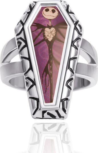For Tim Burtons The Nightmare Before Christmas fans, this Jack coffin ring is a ghoulish delight. Jack Skellington coffin ring features fanciful side etchings and a clear center that unveils Jack Skellington resting against a dark purple background.