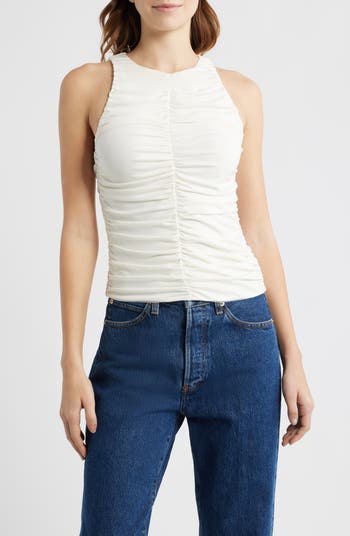 Strategic ruching shapes from every angle a soft and stretchy tank you won t want to cover up.