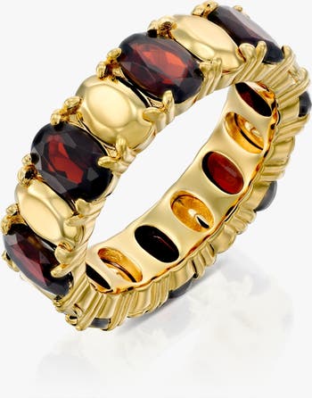 An elegant eternity ring featuring 16 stones, carefully set in alternating patterns of 8 rich natural red garnet ovals and 8 intricate stone castings. Each garnet’s oval shape creates a harmonious design, making this ring an enduring symbol of elegance and style