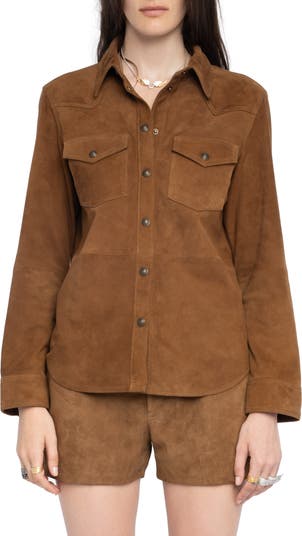 A curved hem lends shirting style to a softly rugged jacket cut from genuine suede.