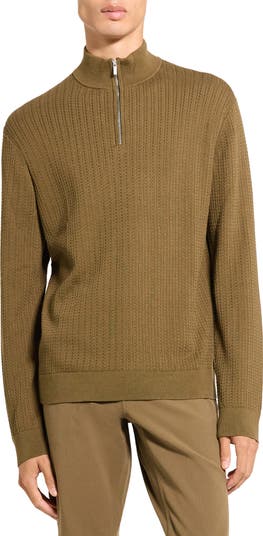 A minuscule laurel-leaf stitch textures an all-cotton sweater knit in a sporty half-zip profile.