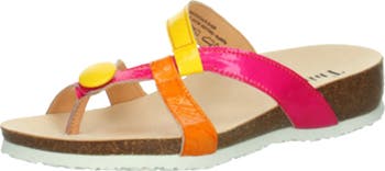 An antiqued ornament tops the narrow straps of a comfy sandal crafted from soft, vegetable-tanned leather and perfected with anatomically contoured support.