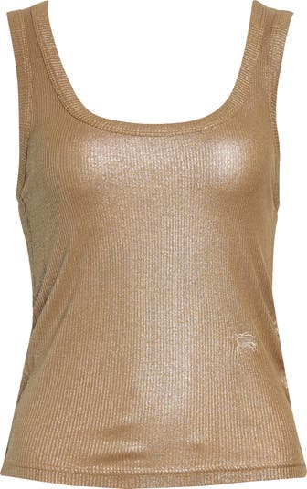 An embroidered Equestrian Knight puts a house-signature touch on this finely ribbed tank dusted with a shimmery metallic coating and shaped with ruched side seams.