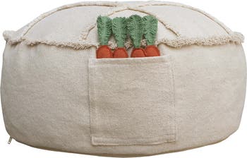 Side pockets store mini-veggies for impromptu games of tic-tac-toe on this plush and whimsical pouf that will add character and texture to any space.