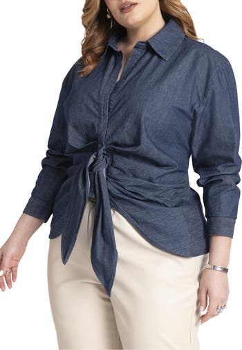 A woven cotton blouse that offers an easy fit with hidden snaps at the upper placket, buttons at the lower placket, and hits at the hip for a relaxed style.