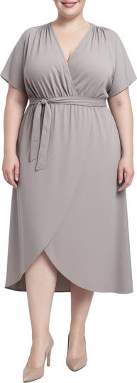 The low-cut surplice neckline is echoed by the high-low tulip hemline—proof that symmetry is still statement making with this faux-wrap dress styled with a high belted waist.