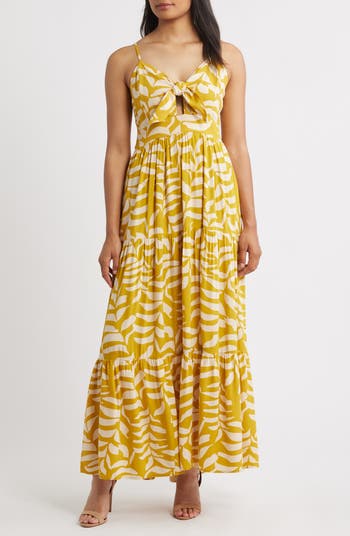 A flouncy tiered skirt enhances the graceful movement of this lightweight maxi topped with a tied-and-cutout bodice.