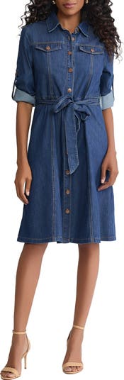 A removable self-tie belt defines the waist of this button-front denim shirtdress cut in a midi-length silhouette.