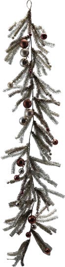 - A festive garland featuring shimmering tinsel adorned with vibrant multicolor ornaments