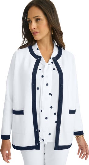 We’re giving the classic cardigan a trendy update with a boxy silhouette and sophisticated tipping. This cardigan strikes a beautiful balance between classic and modern with its crew neckline and bottom patch pockets. Pair it with our Sleeveless Tie Neck Blouse and jeans or chinos to complete the look.