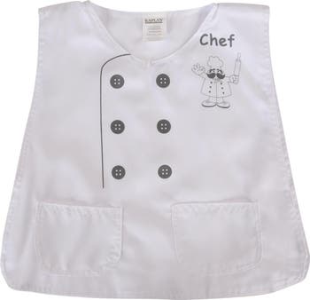 18 months up. Sparks creativity as toddlers role-play as chefs, enhancing storytelling and social skills. Toddlers will love cooking up food for their friends as they role play as a chef. Encourages teamwork and cooperative play. Features easy over head design with Velcro® side closures, chef hat with elastic band, two pockets and printed buttons. 100% Polyester. Machine washable.
