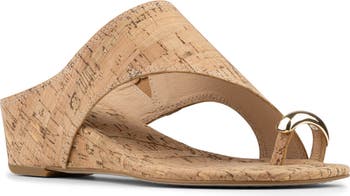 Golden hardware shines at the toe of a stylish cork sandal lofted by a low wedge.