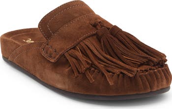 Fringe and tassel embellishments add vintage vibes to a suede mule that s a casual style staple.