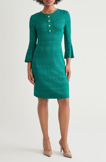 Pleat-flared cuffs add a dramatic flourish to this standout dress cut in a sheath silhouette from a soft knit textured with tonal stitching that adds depth and subtle pattern.