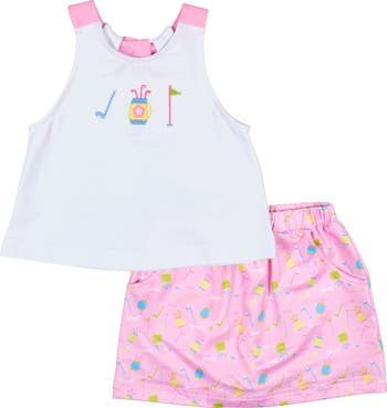 Perfect for sunny days on the move, this two-piece set pairs a soft white jersey knit top with a playful pink golf print performance skort. Cheerful appliqués of a golf club, bag, and flag bring the theme to life, while a back button closure on the top keeps the fit sweet and easy.\nThe coordinating skort offers the look of a skirt with built-in shorts for comfort and confidence during active play—ideal for vacation outings, resort activities, and warm-weather adventures.
