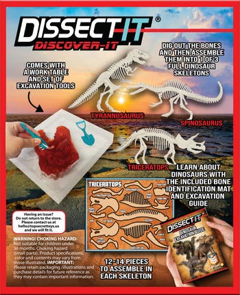 DISSECT-IT: DINO DIG - Discover a complete dinosaur skeleton, hidden inside a synthetic T-Rex. Detailed Excavation Guide included and all tools provided. No dirt or mess as kids explore and learn the real skeletal structure of the dinosaur. Made out of firm gelatin-like material that’s easy to clean, Dissect-It Discover-It Dinosaur Dig gives the realistic experience of excavating dinosaur bones from the comfort of your own home! INCLUDES – A dinosaur dig pit with one full plastic skeleton inside, a work table, a bone identification mat, a learning guide, and two double ended excavation tools. One tool is a scalpel/tweezer for slicing into the gel and lifting out the bones and the other is a scraper/shovel which can be used to remove satisfying ribbons of gel and scoop them out of the pit.