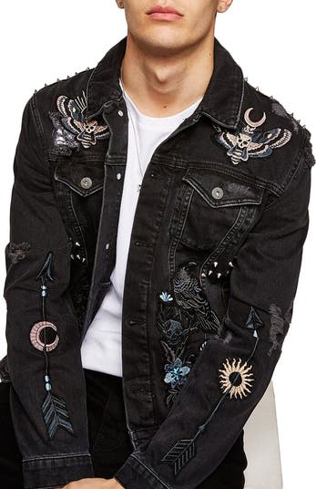 A medley of rebelliously cool patches marks an amply distressed black denim jacket that takes rocker style even further with cone stud embellishments.
